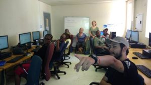 Day 1 is attended by six individuals, and focusses on Excel and Word.  Day 2 is attended by eight, and focusses on Google Earth, GPS’, and any other potential questions.  Samara, Kaggie, and Ged, three of the Round River Botswana program leaders, use a front-facing projector to provide visual context for their instruction. The community members, among which include Escort Guides from the Khwai Community Trust and researchers from the DWNP (Department of Wildlife and National Parks in Botswana), sit at computers and follow along. Students float throughout the room, assisting with any questions that arise.