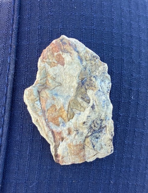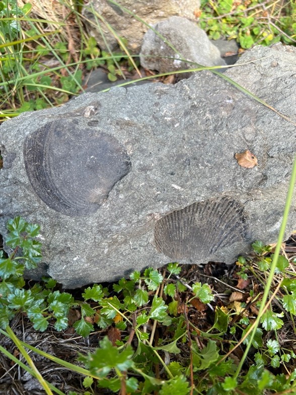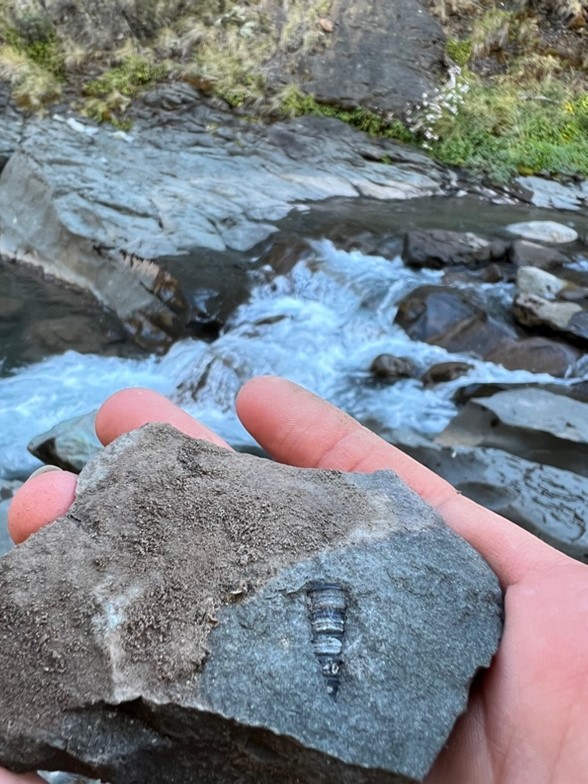 After lunch, we donned our packs and began hiking. It was lovely to get to backpack again since we had been car camping during our last project. We set up camp next to the river, then we split into two groups to scout the area and try to find a good place to begin transects the next morning. One group walked alongside river, while I went with the other group up the hill. We hiked up a steep incline and were met with a ravine too perilous to pass and a beautiful view of the valley. The leaves were just beginning to turn red and yellow. We could see the jagged lines of exposed rock on the mountainside and our little campsite down below. We headed down to the river to look for a way around the ravine where we meet up with the other group who had found a bunch of marine fossils. The perfectly preserved seashells and imprints of shells dotted the rocks.