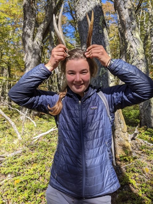 Hailey Kellison (top) and Lily Simko (bottom) posing with huemul antlers. Credit: Sara Grillo.