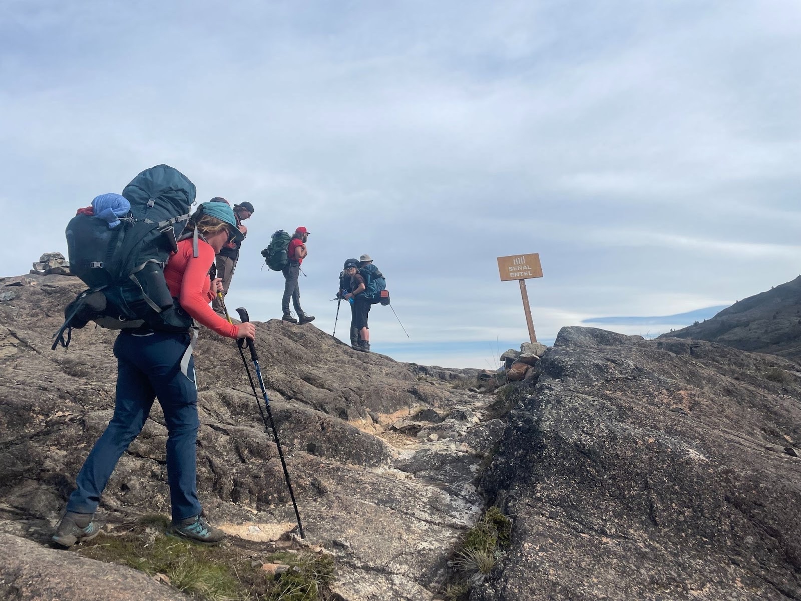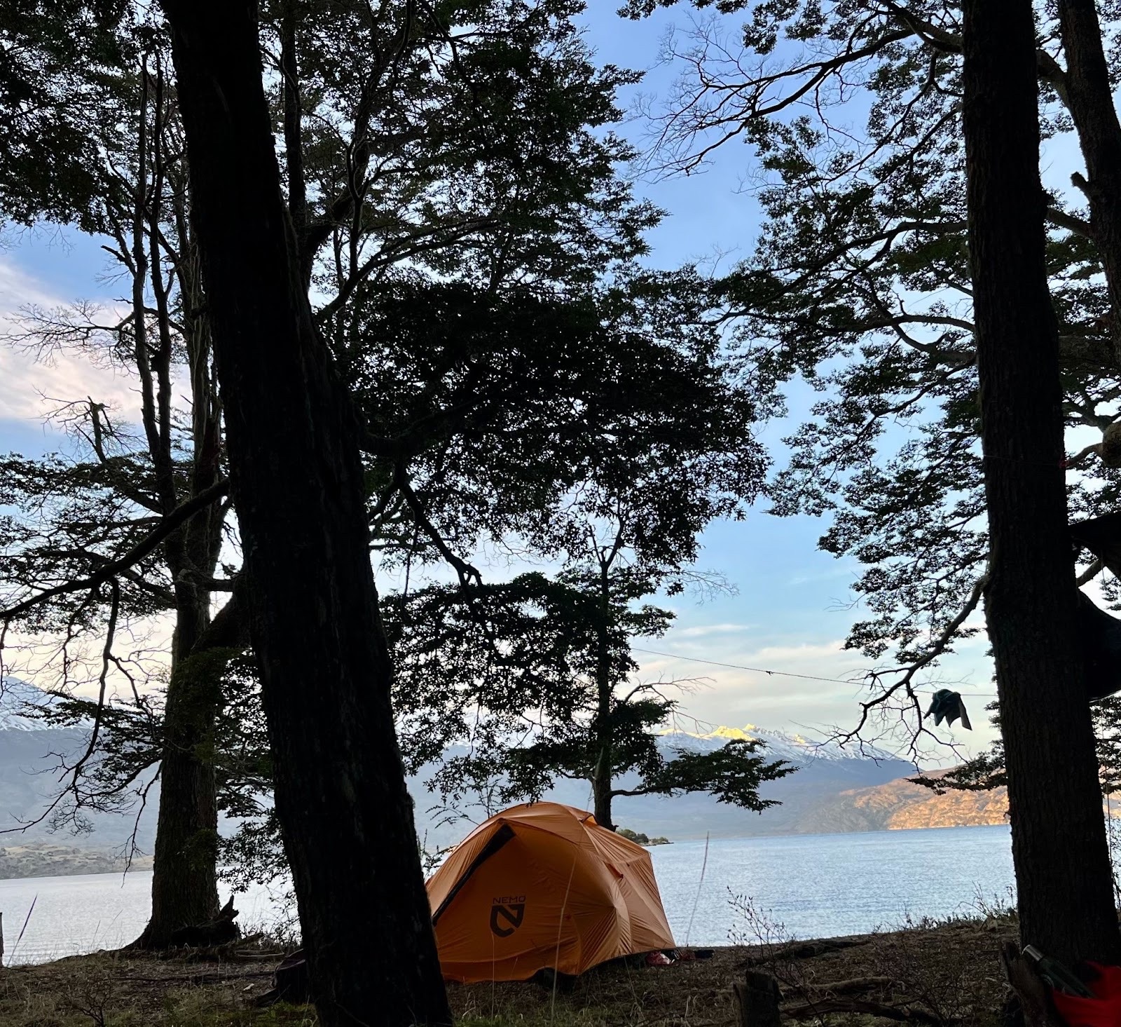On Monday, September 26, we woke up to a rainy cold morning, more excited at the prospect of staying in our quincho and drinking mate than going out for our first backpacking trip. After packing up camp, our two vans headed to the Tamango sector of Patagonia National Park (PNP) to hike across a landscape sculpted by glaciers, test gear and experience the vast diversity of flora and fauna in the area. We stopped quickly in Cochrane to pick up fresh-made bread from a local bakery and headed towards the park, where upon arrival two rangers made sure we knew the park’s rules and the Las Aguilas trail. After mouthfuls of fresh bread and a hacky-sack circle to warm us up, the dismal mood from the rain turned into one of excitement as we embarked. The Tamango reserve was founded in 1967 and later integrated into the Patagonia National Park. The restoration of these national parks were a part of the Rewilding Chile, a vision of conservation for protecting 28 million acres, spanning across 17 national parks. After hiking through Lenga and Ñirre forest we stopped near a couple cabins and couldn’t resist the temptation of greasy, warm bread awaiting us. We noticed the run-down, brown grass and noted that there had been humans there, sharpening our skills of identifying the impact of humans versus other animals. Leave No Trace principle number 2 was taught to us by our instructor Cal as she went over the importance of walking on durable surfaces. More bread was consumed before we were on our way again. The trail took us above Lake Cochrane. The rain had slowed down throughout the day, allowing the sun to poke through, glistening on the backdrops of snow-capped mountains. We skirted its perimeter, hiking up and down hills, crossing bridges and dodging native calafate shrubs. We stopped for a hearty lunch of tuna, salami, and peanut butter and jelly around midday to go over some preliminary plant identifications and leave no trace principles. Our instructor Cal demonstrated the fine art of leave no trace principle number 3, “disposing of waste properly”, showing us the intricacies of the backcountry bidet. The magic of the fresh bread still held a spell over us, as we gobbled more pieces than we had allotted for ourselves in a day greedily. After lunch, we began walking again along the cliffs of a crystal blue lake, descending around midday to settle into our campsite for the night in a dense Coigüe forest, right at the edge of the lake. With dinner behind us and our tents set up, we settled into our sleeping bags with sore legs, bellies full and hearts content.