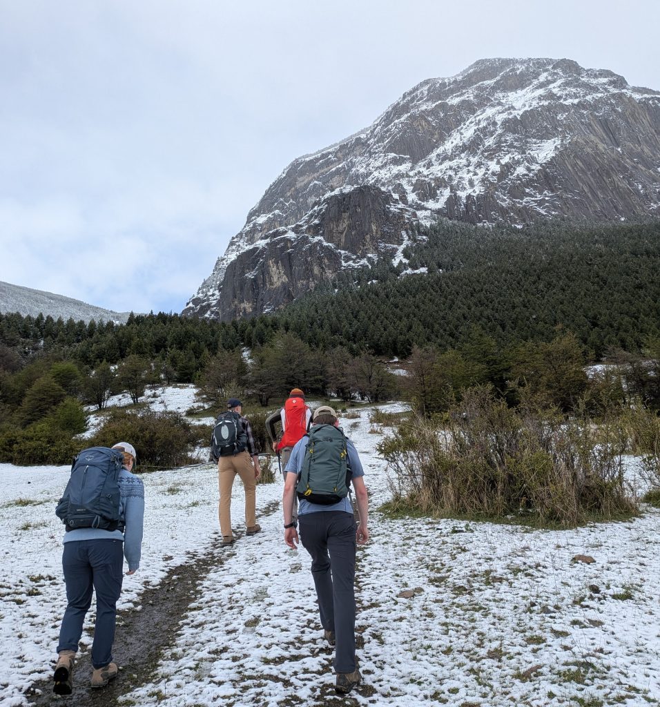 After a few days of settling into the hostel in Coyhaique, including orientation talks, beginning classes, and figuring out the chore chart, we had our first day off. A group of us decided to use that time to get outdoors on a hike nearby. After only a kilometer or two of walking, it felt like we were in a different world. The streets, houses and shops with their wood smoke and urban atmosphere fell away, and soon we were hiking up a steep trail in a forest filled with fresh snow. Despite their proximity, the city streets and the wild mountains feel worlds apart. Coming from a flat suburban area in the US, this sharp contrast between the completely uninhabited areas and the city streets felt like an exciting new experience.