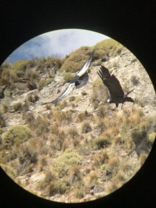 Two of the most prevalent things you can find almost anywhere in Patagonia are spikes and condors. During the moments we were not looking down at the ground trying to avoid the thorny neneo (Mullinum spinosum) or buzzy burs (Acaena magallanica), we could look up to the sky and constantly see the condors’ rectangular outline contrasting against the clear, blue, Patagonian sky. The Andean Condor or Cóndor (Vultur gryphus) is the largest flying bird in the world with wingspans as large as 3.3 m (10ft. 10 in.) and a maximum weight of 15 kg (33 lbs.). They are also one of the oldest living birds in the world and can live for 50 years in the wild and up to 80 in captivity. We were taught to easily identify them in flight by looking for an all-black body and rectangular wings with “fingers” sticking out of their ends. These “fingers” are called a bird’s primary feathers and they are responsible for steering and thrust during flight. Other key identifying characteristics of the condor include a completely bald head, white feather collar around the neck, and white feathers on the topside of the wing which are practically invisible when observing the condor from the ground.