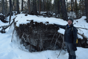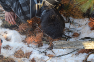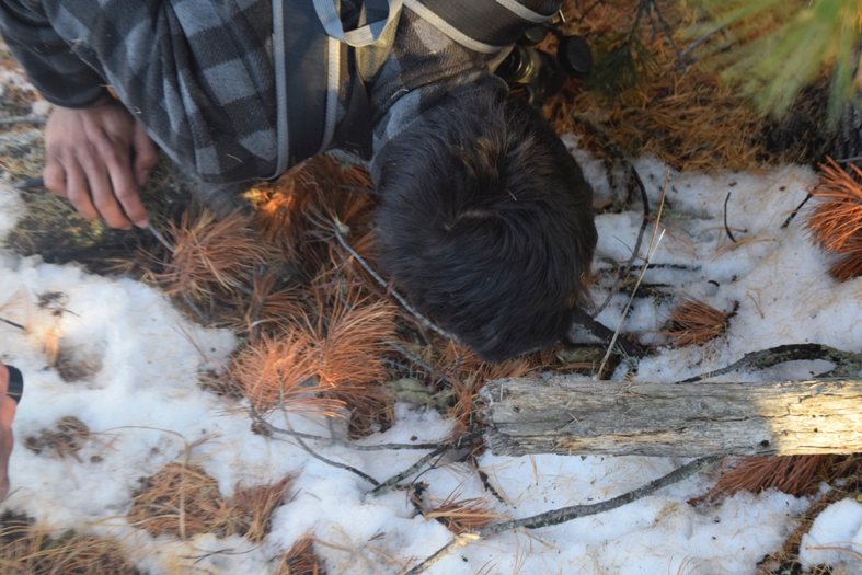 Okay, soooo quick change of plans. Winston’s back! Again, we found ourselves on a hot pursuit of the all mighty wolverine poop. Winston was following an animal trail that traced the edge of a cliff which led to the riverbed down below. Tracks on tracks on tracks! Our determination never died as we eagerly searched around the path for a sign of poop. As our eyes were scanning every inch, something strange came into our view. There was a large wooden contraption leaning up against a pine tree. Wait a minute! This is the core zone, there isn’t supposed to be any human activity here. But, wait! Could this be? POOP! Just underneath the large wooden thing, was a beautiful pile of poop. We all got our faces down there to get a good whiff to see if it had that distinct wolverine poop smell. Ahh, we finally did it! The dream had come true.