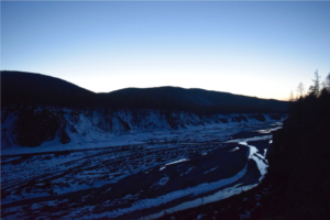 It was the first hike, and the group was The Backseat Boys (KT, Jerm and me) featuring Bob (Chris). This was a very, very, very long day. The plan was to retrieve the furthest cameras from camp, but other things ended up happening. We woke up extra early in order to get a head start on the day (definitely Bob’s idea). So, at 7:00 in the morning, we stuffed our faces full of peanut butter and oats and headed down to cross the freezing Mungash river. When we got there, our boots came off and our trusty crocs went on. With thoughts of warm hot tubs in our minds, we marched through the cold, flowing water. The actual crossing of the river wasn’t the bad part, it was getting out of the water that was rough. Once our feet and legs exited the water and entered the cold world of the wind, it got pretty chilly. With stiff and cold feet, we all got our socks on and laced up our boots. Off we went with much, much colder feet. Now, when we got back to camp later that night, we found out that the temperature was around -7°C at 8:00 in the morning. We left at 7:00 in the morning, an hour before that reading was taken, which means it was a lot colder. However, we didn’t need this information to know that it was cold out. One look at either my crocs or Jerm’s showed you how cold it was because of the rocks that were glued to the bottom after stepping out of the river and onto the rocky riverbed. We were in for a very cold morning.